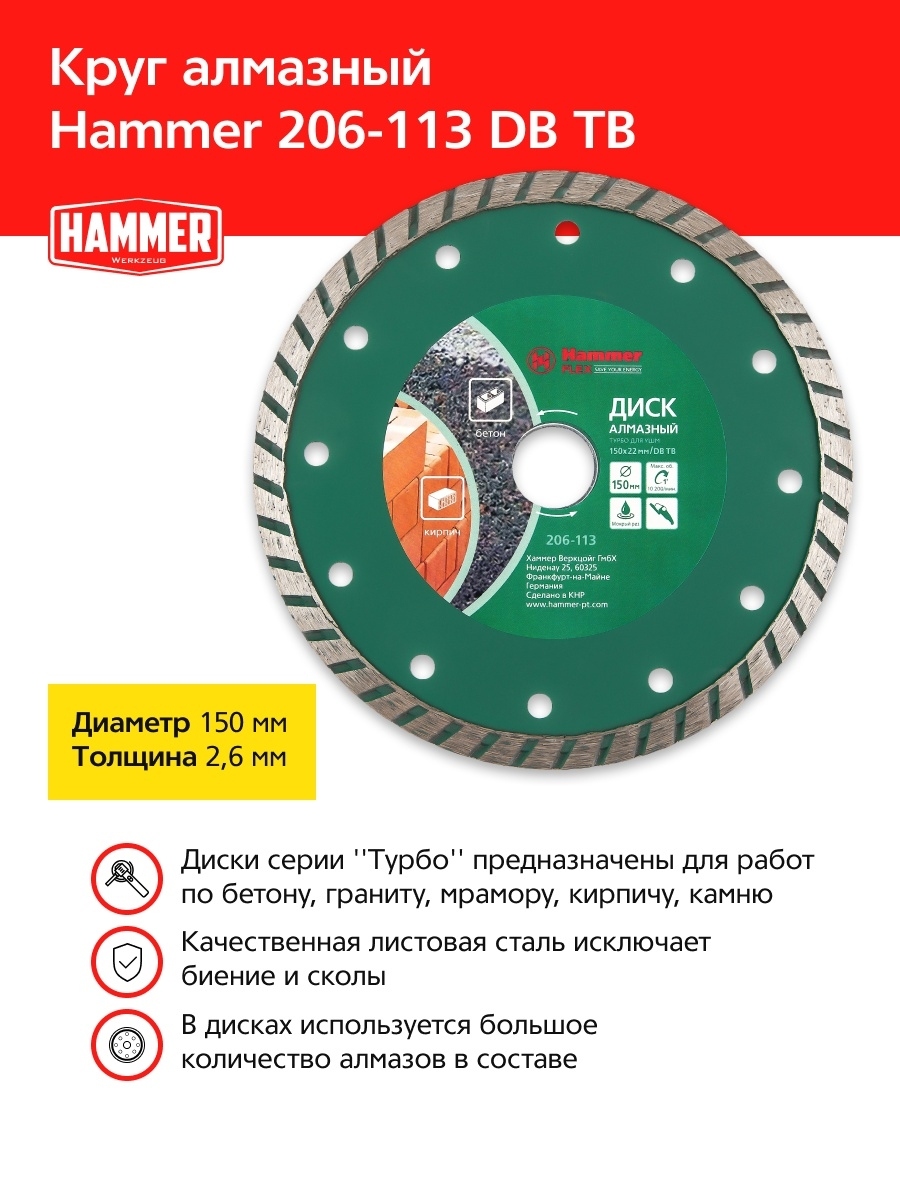 Диск алмазный 150x22мм турбо Hammer Werkzeug 206-113