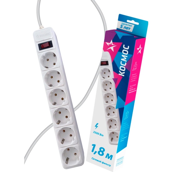 Фильтр сетевой 6мест/1,8м с заземл. 16А IP20 3.5 кВт Космос