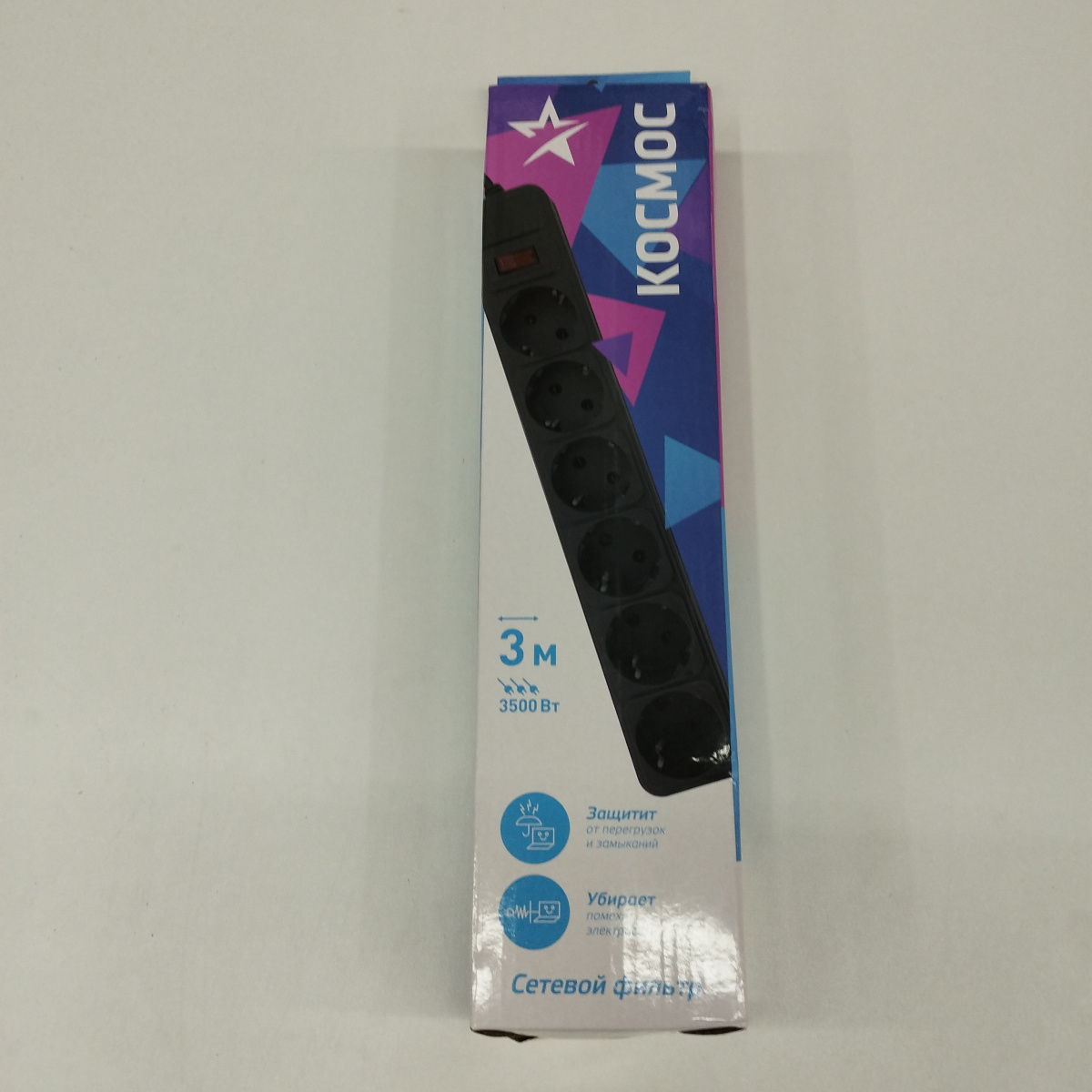 Фильтр сетевой 6мест/3м с заземл. черн. 16А IP20 3.5 кВт Космос